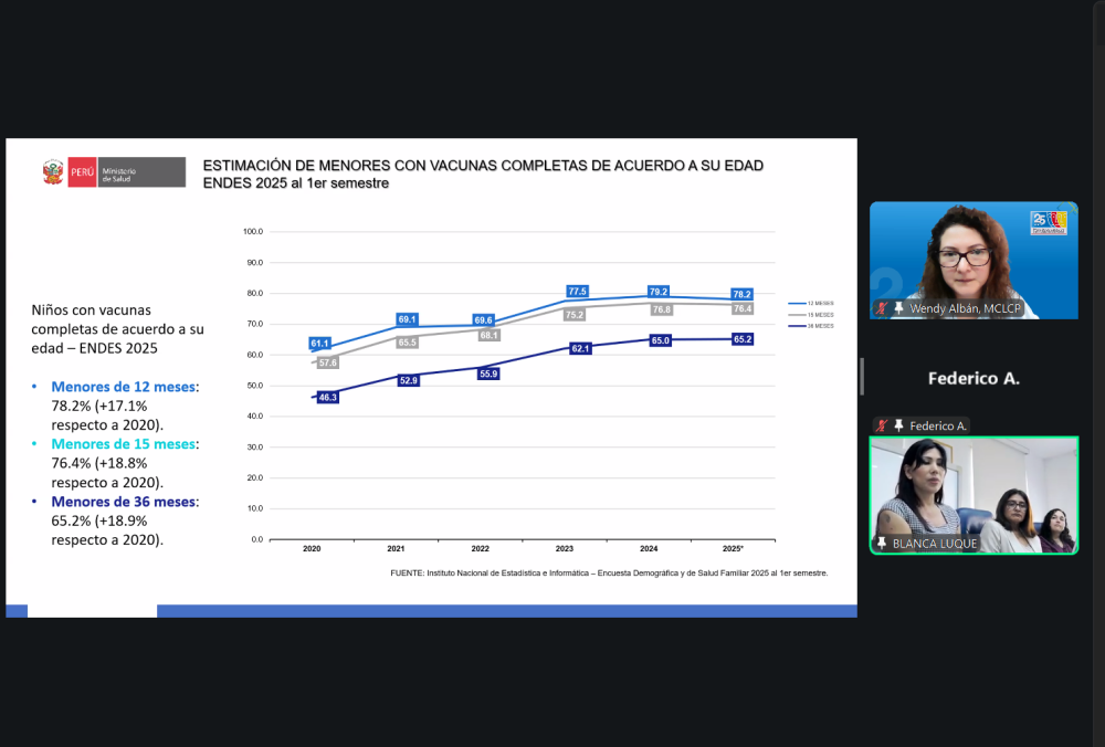 Entre los principales logros del 2025, se destacaron los avances en inmunizaciones, alcanzando el 100 % de la meta en la vacunación contra el virus del papiloma humano (VPH), así como la vacunación contra el dengue en cuatro regiones priorizadas. También se resaltó la actualización de vacunas contra el VPH y neumococo, y la incorporación de la vacuna hexavalente.