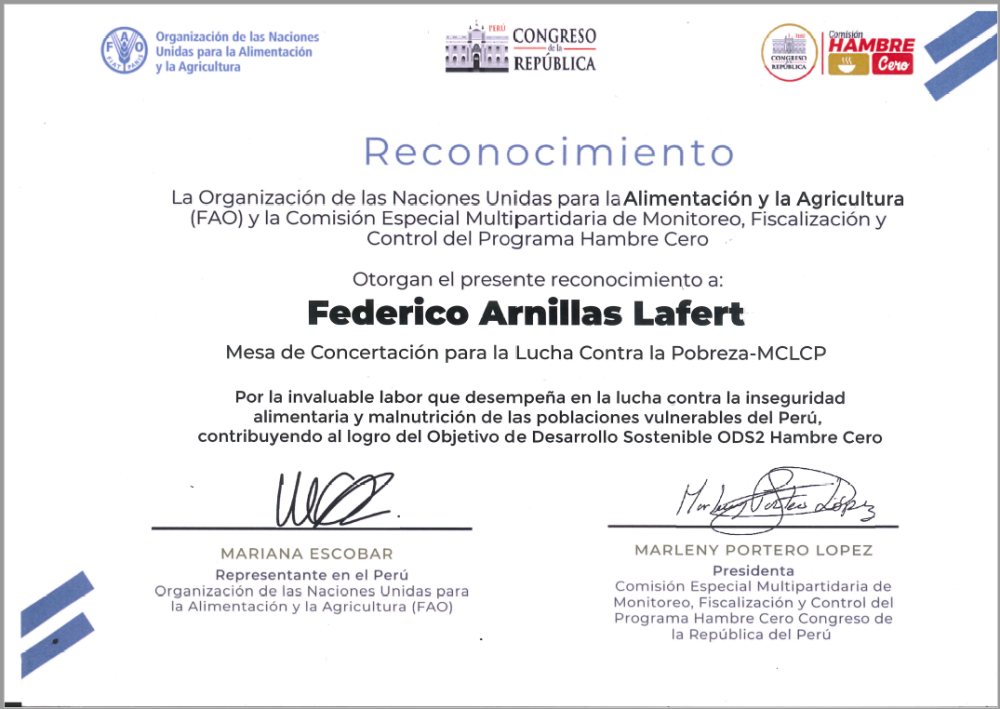 En ese sentido, el presidente de la Mesa de Concertación para la Lucha contra la Pobreza (MCLCP), Federico Arnillas Lafert, recibió el reconocimiento por la labor que la institución a su cargo desempeña en la lucha contra la inseguridad alimentaria y su contribución al logro de los Objetivos de Desarrollo Sostenible, principalmente por el Objetivo N°2 poner fin al hambre.