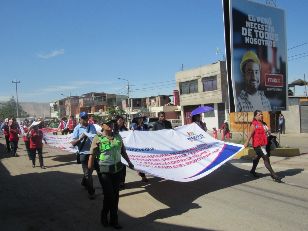 La Mesa de Concertación Moquegua y un conjunto de instituciones del Estado participaron en la Marcha de Sensibilización y Feria Informativa por el Día Internacional de la Mujer, con la finalidad de brindar herramientas informativas y promover la reflexión para la prevención de la violencia hacia la mujer y los integrantes del grupo familiar.
