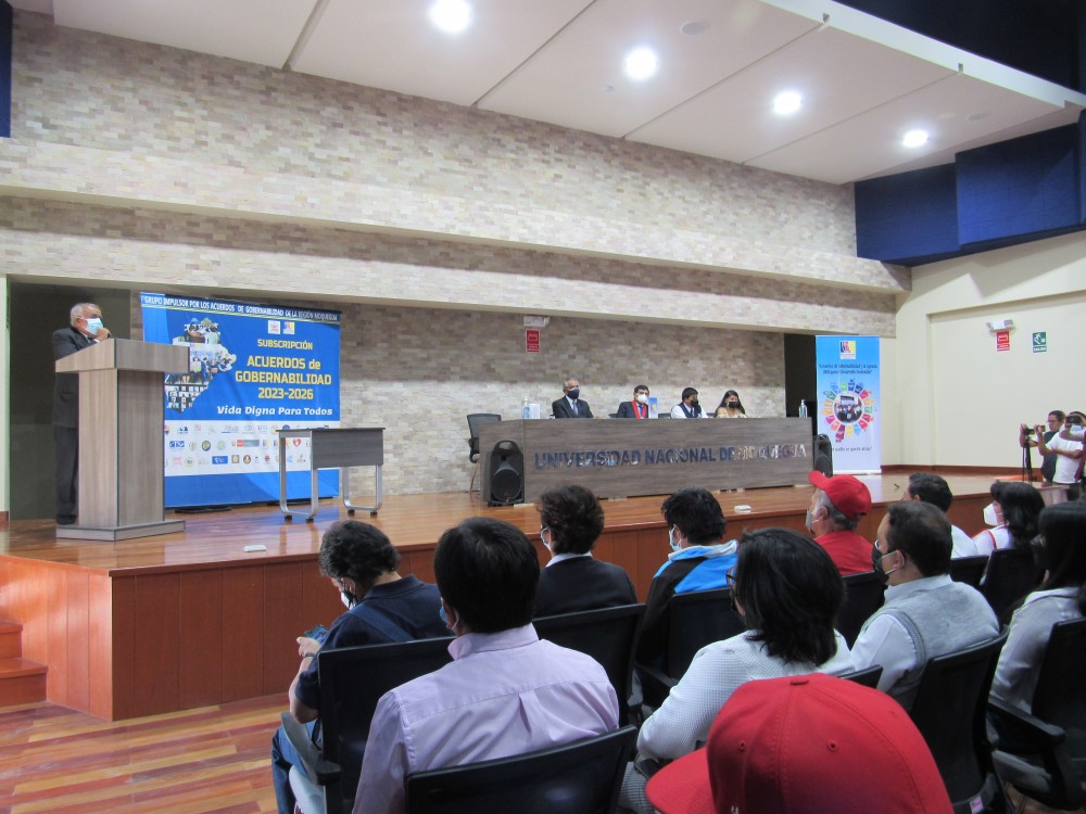 El miércoles 24 de agosto en instalaciones del auditorio de la Escuela Profesional de Ingeniería de Minas de la Universidad Nacional de Moquegua (UNAM), candidatos y candidatas al Gobierno Regional de Moquegua y a la Municipalidad Provincial Mariscal Nieto, firmaron el Acuerdo de Gobernabilidad para el Desarrollo Humano Integral de la región y provincia Mariscal Nieto 2023 – 2026.