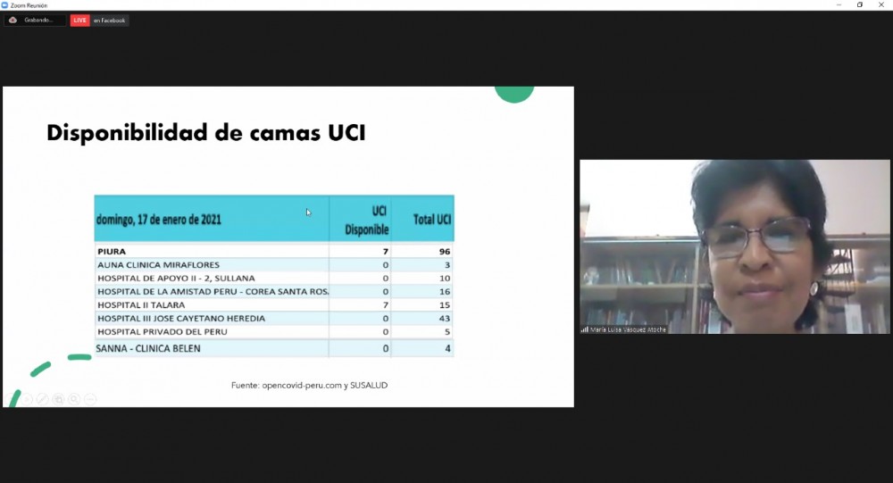 Por su parte, la obstetra María Luisa Vásquez Atoche, representante del Foro Salud, en su ponencia habló sobre la salud en la región Piura, dando una mirada en cuanto a la salud de la niñez y materna. La obstetra señaló que el año 2020 el distrito de Sapillica reportó una prevalencia de DCI 42.3%, y solo el 15 % de niños y niñas de 110 a 130 días recibió suplemento de hierro, teniendo un avance en el cumplimiento de actividades del Programa Articulado Nacional Nutricional de un 27 %. Así mismo, sostuvo que estas incidencias se ven mayormente en lugares de la sierra piurana. También manifestó que en los indicadores del mismo año se produjeron 22 muertes maternas siendo la principal causa la hemorragia. María Vásquez plantea como desafíos la difusión y el monitoreo constante del Plan Regional de Salud para afrontar la segunda ola por COVID-19, promover y garantizar la atención de la salud mental de la población, y dar continuidad a la Red de Soporte para la Persona Adulta Mayor con Alto Riesgo y a la Persona con Discapacidad Severa, en el contexto del COVID-19.