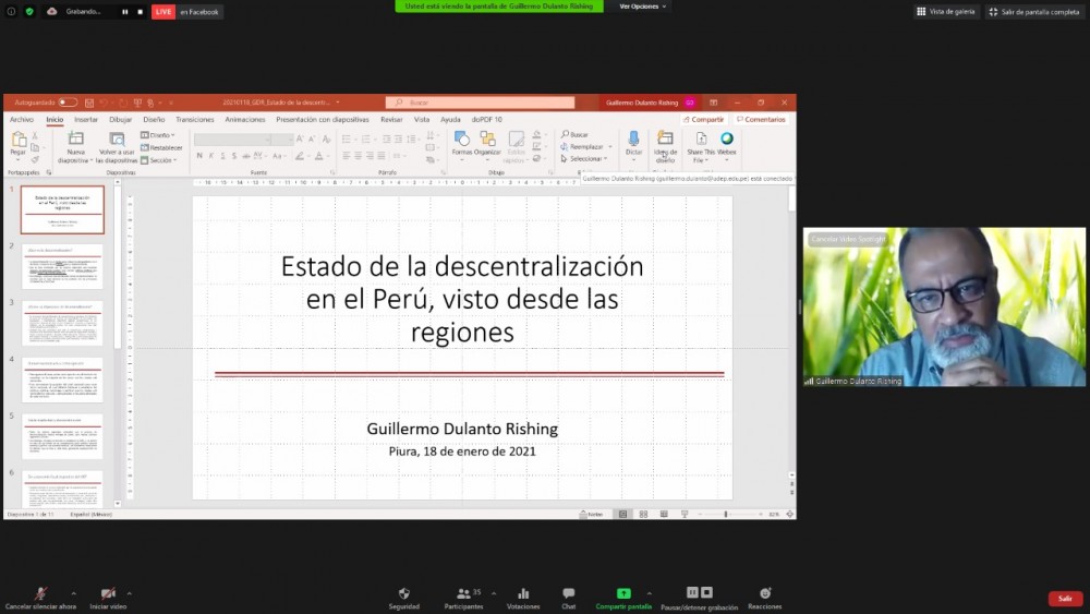 La ponencia empezó con el economista Guillermo Dulanto Rishing, quién analizó el estado de la descentralización en el Perú, visto desde las regiones. El catedrático señaló que la descentralización es un medio para reducir la desigualdad en el territorio, y este requiere de un proceso para su implementación, el cual es entendido por los actores regionales en el reclamo de mayor competencia para poder realizar políticas públicas que reduzcan las brechas existentes. También señaló que la transferencia de competencias y funciones a las regiones donde se estableció un paso de acreditación sin verificar las capacidades de los niveles subnacionales, dejando de lado muchos programas, proyectos y organismos públicos. Por otro lado, señala que el nivel nacional es el ejecutor de los territorios, lo cual no debería ser así, pues estos programas y organismos realizan y ejecutan los territorios. “Más del 55 % del presupuesto de ejecución de los territorios lo hace el nivel Nacional. El tema de descentralización es un tema clave, porque ningún gobernante podrá realizar políticas públicas y eficientes si tiene un estado como el nuestro” finalizó Guillermo Dulanto.
