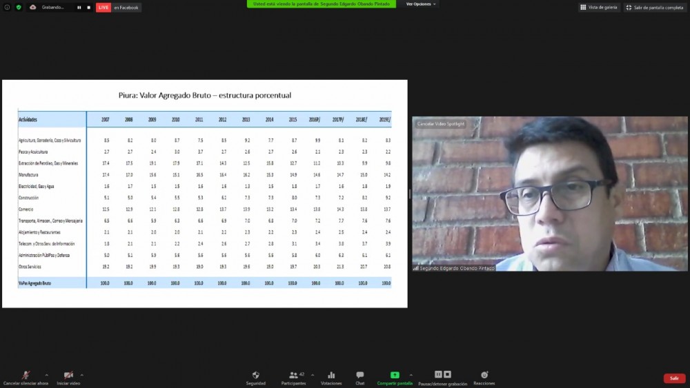Continuando con las exposiciones, el economista Segundo Obando centró su ponencia en el desarrollo económico en el contexto del Covid-19 y los desafíos sostenibles para la región. Obando hizo referencia a los retos y la forma en como los agricultores vienen superando la crisis que trajo consigo la pandemia para este sector. “Todos los sectores económicos de la región tuvieron un retroceso en cuanto a su crecimiento. Aquí tenemos al sector agrícola al que me voy a referir, este tuvo un retroceso de 1.3 % en comparación a periodos de años anteriores. De acuerdo con el Censo Nacional de Agropecuaria del 2012, nos dice que existen 1 895,9 millones de hectáreas para la actividad agropecuaria; el predominio de la agricultura minifundista no permite aprovechar las ventajas de las economías de escala para minimizar costos, limita la inversión de tecnologías, y difícilmente logra tratos comerciales eficientes. Frente a ellos surge la necesidad de promover la asociatividad de los pequeños productores. Viendo ya un caso específico de impacto de la Covid-19, está el del banano orgánico; para marzo la tendencia cambió, la pandemia ya estaba presente en nuestro territorio, se observaba el tema logístico y humano como base de producción, y esta disminuyó afectando a los productores, realizando exportaciones de 21, 082 toneladas por 15 millones de dólares, 13 % menos en volumen y 11 % menos en valor, para abril la tendencia era la misma”, puntualizó Obando.