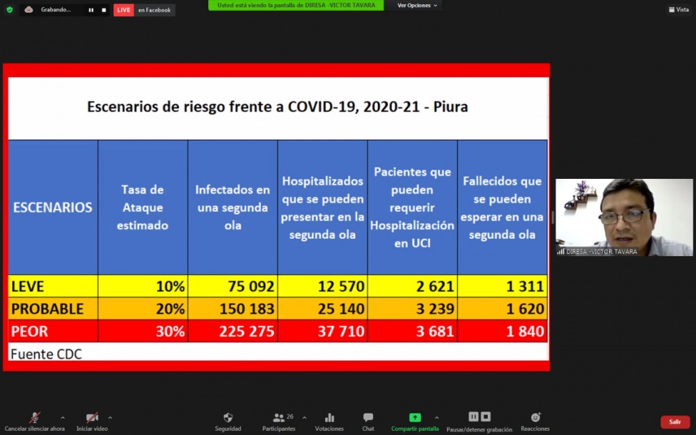 Así mismo, Távara manifestó que, frente al contexto que se está viviendo, se viene haciendo un trabajo de preparación de respuesta. “Se debe aclarar que se está hablando mucho de una segunda ola, pero los expertos de la Organización Mundial de la Salud opinan que aún estamos en la primera ola que aún no termina de descender, y en las cifras mostradas se observa que nuestra positividad en la región nunca bajó del 25%, es decir seguimos todavía dentro del primer impacto; frente a ello nos estamos organizando para responder a la problemática que está viviendo, el cual lo definimos en tres niveles: en el primer nivel de atención se está trabajando en el control de transmisión del virus, a nivel comunitario y de establecimientos, y así fortalecer cada uno de ellos por provincias, distritos y a la región; afortunadamente Piura ha conseguido implementar áreas de hospitalización temporal en sus 8 provincias, logrando implementar áreas de aislamiento temporal, que servirían para aislar y atender a los pacientes que den positivo, hacerles el seguimiento respectivo para evitar más contagio con el entorno de cada paciente; en Sullana y Piura están las áreas de cuidado crítico temporal, siendo estas las dos más grandes que tiene la región; se cuenta también con 5 isotanques distribuidos en los Hospitales de Santa Rosa, Sullana, Chulucanas, Establecimiento de Salud I 4 Talara y Establecimiento de Salud I 4 Sechura; las intervenciones en Primer Nivel también se vienen dando a través de la atención con equipos de protección al personal, medicamentos, medios de transporte viral, central de llamadas, equipos de respuesta operativos, también se implementó la Casa Solidaria, Centro de Aislamiento Temporal; se ha realizado trabajo articulado con las municipalidades para la conformación de comités anticovid, fiscalización: aforo, protocolos, playas, mercados y centros comerciales y la promoción de la salud principalmente en los mercados, así mismo el presupuesto para el plan COVID-19 segunda ola es: 2020 (IV TRIM) S/ 74 623 990.00, 2021 anual S/ 24 328 498.00”, finalizó el director regional de salud.