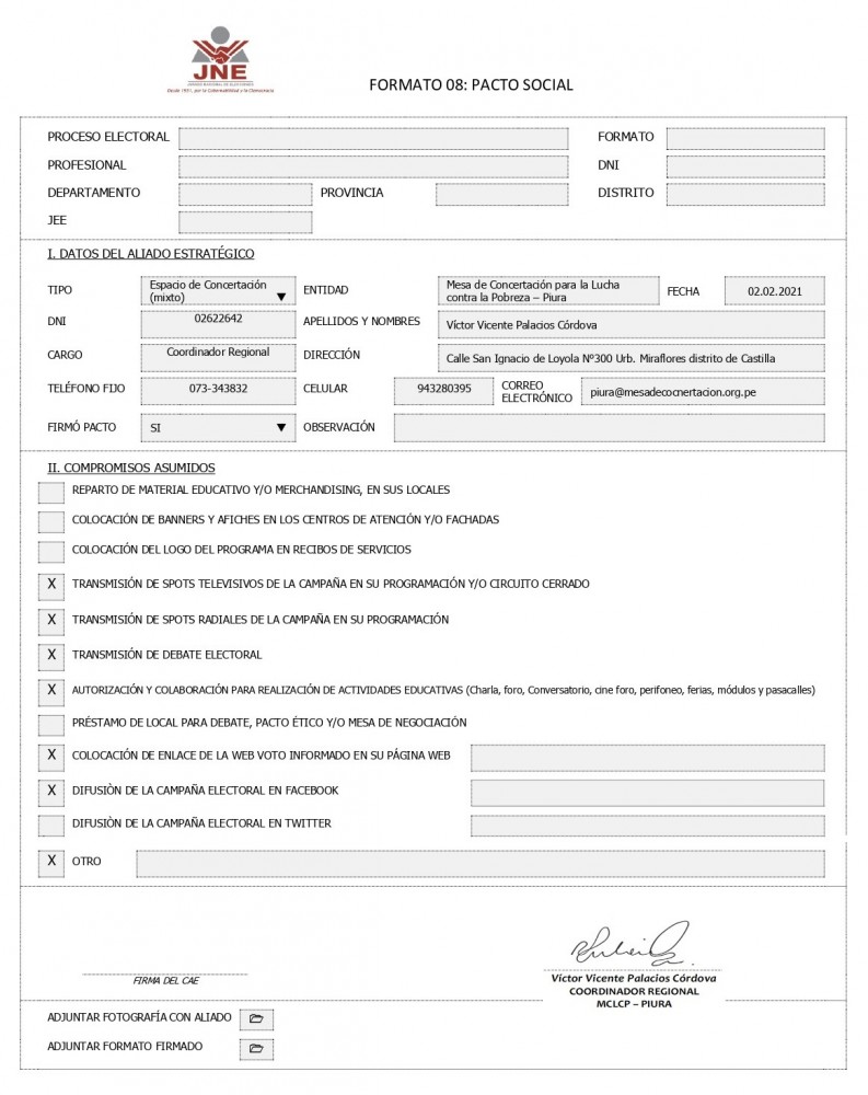 Por su parte, el abogado Otto Morán, representante del Jurado Nacional de Elecciones, indicó que mediante el Pacto Social el JNE busca establecer acuerdos con representantes de la sociedad civil (empresas privadas, organizaciones del Estado) y medios de comunicación para que apoyen en la difusión de la campaña del voto informado, teniendo como objetivo que los electores conozcan mejor a los candidatos, sus planes de gobierno, proyectos e ideas.