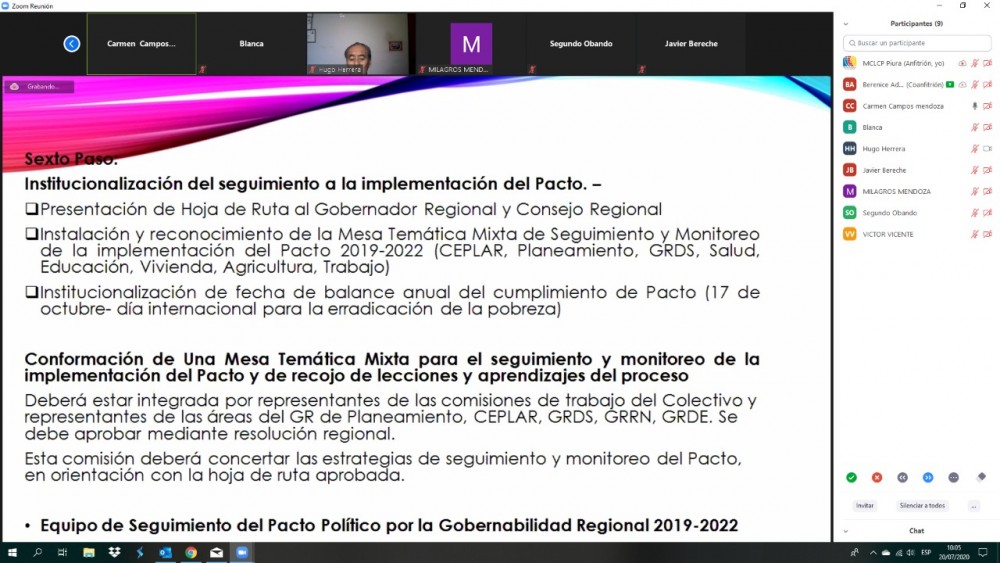 El Equipo Técnico de Seguimiento de Sociedad Civil del Pacto Político por la Gobernabilidad 2019-2022 presentó una propuesta de Hoja de Ruta para su implementación a la Gerencia Regional de Planeamiento y Presupuesto. El coordinador regional de la MCLCP precisó que el Pacto Político por la Gobernabilidad fue ratificado y aprobado por el Gobernador Regional, además cuenta con Acuerdo Regional N° 1620-2019/GRP-CR, aprobado el pasado 24 de octubre de 2019.