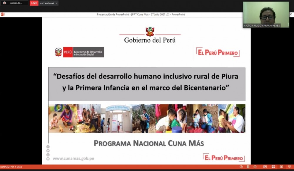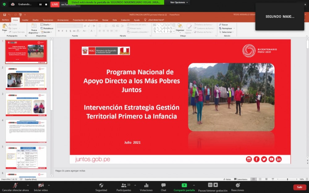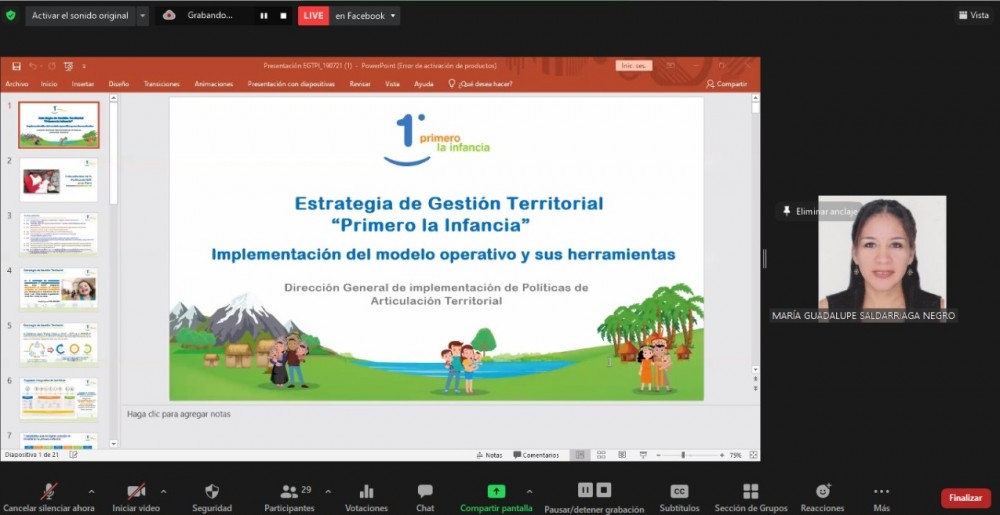 La ponencia dio inicio con Guadalupe Saldarriaga Negro, coordinadora de Enlace MIDIS, quien señaló que en el marco de la emergencia sanitaria nacional, el MIDIS ha te tenido un rol de atención de políticas públicas y aquellas medidas que nacieron en el marco de la emergencia sanitaria como los bonos y la red Amachay, que se han sumado a todas las acciones regulares que se vienen realizando. Así mismo mencionó que lo que busca la estrategia de gestión territorial primera infancia, es un piloto a nivel nacional realizado en cuatro regiones, Piura, Ucayali, Huancavelica y Cusco, es poder incrementar el acceso al paquete integrado de servicios desde un acompañamiento y una asistencia técnica permanente a los gobiernos locales de los territorios mencionados.