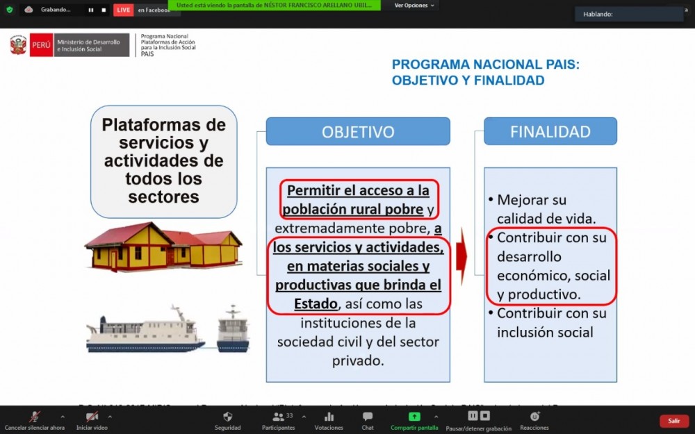 Para Néstor Arellano, JUT Programa País, el programa viene trabajando en permitir el acceso a la población rural pobre y extremadamente pobre a los servicios y actividades en materia sociales y productivas que brindan el Estado, así como las instituciones de la sociedad civil y del sector privado, con la finalidad de contribuir con el desarrollo económico, social y productivo, así mismo mejorar su calidad de vida, y contribuir con la inclusión social, y señala que Las líneas de acción a nivel nacional están dentro de las articulaciones de las políticas públicas tanto del gobierno nacional, regional y locales, teniendo como ámbito de acción los centros poblados rurales menores a dos mil habitantes ubicados en sierra, selva y zonas de frontera con población pobre y extremadamente pobre, así también en áreas rurales y rurales dispersas.