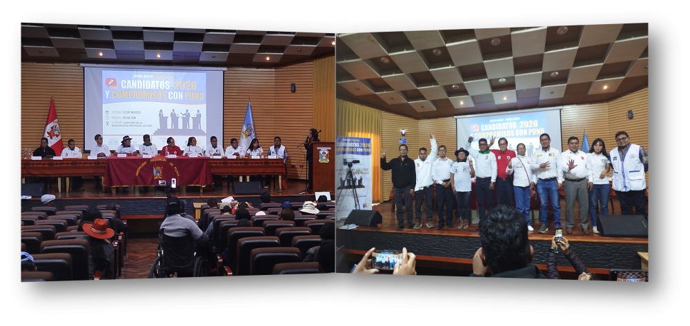Puno, 12 de marzo de 2026.- En el marco de la promoción de la participación ciudadana, la Mesa de Concertación para la Lucha contra la Pobreza (MCLCP) participó como coorganizadora en un diálogo político con once candidatas y candidatos, quienes expusieron sus propuestas sobre temas prioritarios para la región, como educación, comunidades campesinas y territorio.