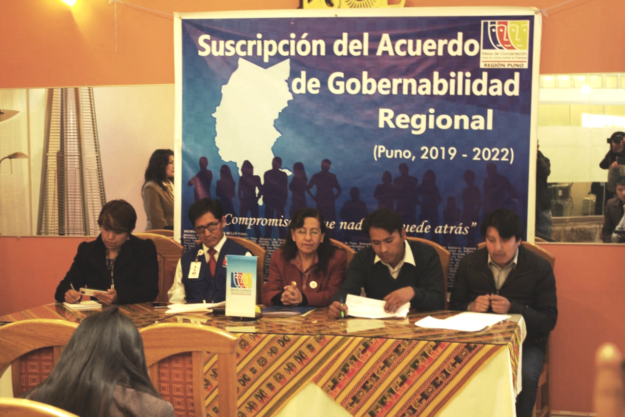 La MCLCP de Puno es un espacio de diálogo y concertación conformado por más de 100 representantes de Estado y sociedad civil y que tiene como uno de sus objetivos consensuar propuestas de política regional que coadyuven a contribuir en el cierre de brechas y desigualdad, bajo el lema “Por una vida digna para todos y todas”. Desde el año 2002 en cada proceso electoral regional y local ha venido elaborando el documento denominado “Acuerdo de Gobernabilidad Regional”, el cual recoge las necesidades prioritarias que requieren ser atendidas por nuestras autoridades y las mismas que están alineadas a los diferentes políticas públicas nacionales y regionales.