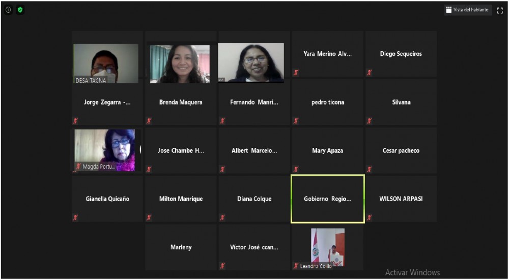 La vicegobernadora regional, Magda Portugal, dio la bienvenida y el saludo a los asistentes de la reunión y enfatiza que el compromiso con Tacna es primero. Seguidamente, Serafín Mamani, de la Dirección Ejecutiva de Salud Ambiental de la Dirección Regional de Salud, presentó la siguiente ponencia "Manejo de Residuos Domiciliarios y Comerciales en Estado de Emergencia Sanitaria Covid-19".
