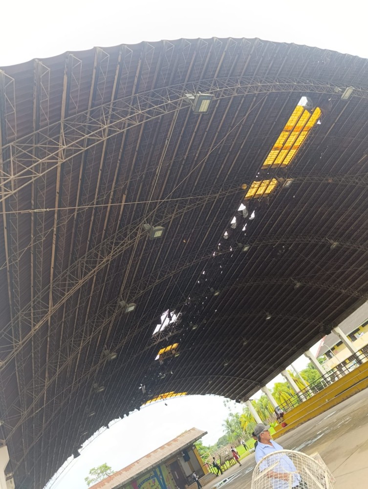 Espacio deportivo afectado: El techo del polideportivo se encuentra abierto, lo que permite la filtración de lluvia e impide su uso en condiciones climáticas adversas.