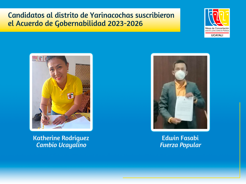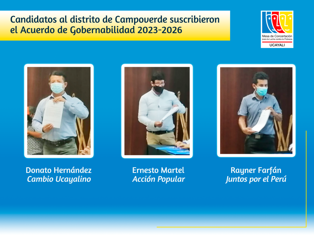 El Acuerdo por Campo Verde fue firmado por Donato Flavio Fernández Andahua de Cambio Ucayalino, Rayner Miller Farfán del Castillo de Juntos por el Perú, Ernesto Martel Figueroa de Acción Popular. Mientras que en el distrito de Yarinacocha, firmaron Edwin Fasabi Rojas de Fuerza Popular, Katherin Melissa Rodríguez Díaz de Cambio Ucayalino.