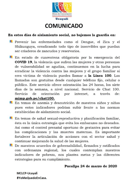 La MCLCP Ucayali difundió el 24 de marzo, a través de su página en Facebook, un comunicado donde informa a la población sobre las recomendaciones a tomar en cuenta durante el estado de emergencia por COVID-2019, el cual también fue compartido por los grupos de Whatsapp del Comité Ejecutivo Regional (CER), los Comités Ejecutivos Distritales (CED) y el Comité Multisectorial por los Derechos de las Niñas, Niños y del Adolescente (COMUDENA).