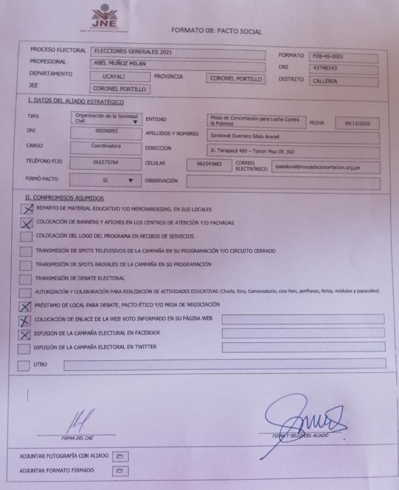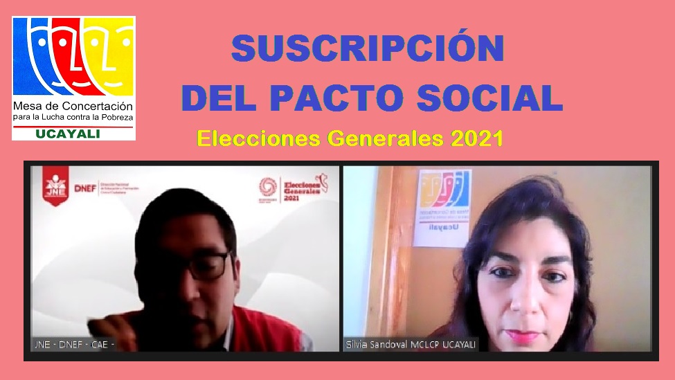 La coordinadora regional de la Mesa de Concertación para la Lucha contra la Pobreza de Ucayali, Silvia Sandoval Guerrero, suscribió el Pacto Social en el marco de las Elecciones Generales 2021, a cargo del Jurado Nacional de Elecciones (JNE) a través del aplicativo Zoom.