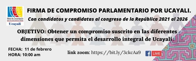 La MCLCP de Ucayali esta convocando a un acuerdo parlamentario con candidatos y candidatas al Congreso de la República, en el marco de las funciones de fiscalización, legislación y representación. El acuerdo ha sido construido por organizaciones de la sociedad civil y Estado, y contiene propuestas en el marco de los Objetivos del Desarrollo Sostenible 20-30, Acuerdo Nacional, políticas de estado, Acuerdo de Gobernabilidad en las dimensiones social, económica, ambiental e Institucional.