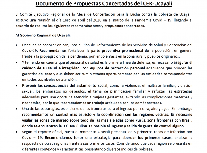 Tras analizar el Plan de Reforzamiento de los Servicios de la Salud y Contención del Covid-19 en la región, la MCLCP de Ucayali recomendó a las autoridades regionales fortalecer la parte preventiva promocional entre la población, en especial en la zona rural y pueblos originarios.