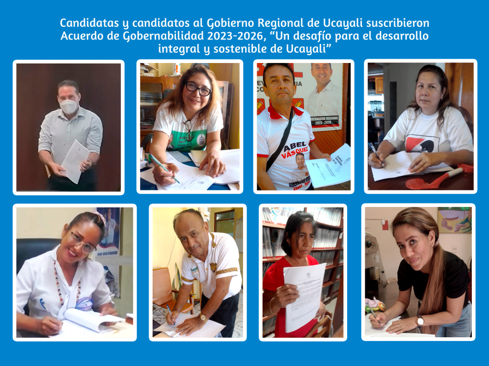 Mediante la firma del Acuerdo de Gobernabilidad 2023-2026, candidatos y candidatas al Gobierno Regional de Ucayali y aspirantes a la alcaldía provincial y distrital de Coronel Portillo, Padre Abad, Atalaya, Masisea, Campo Verde, Yurua, asumieron el compromiso de incorporar acciones que impulsen el desarrollo de la región y mejoren la calidad de vida en la región.
