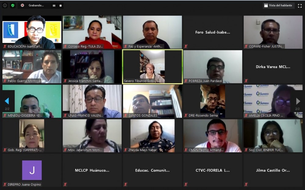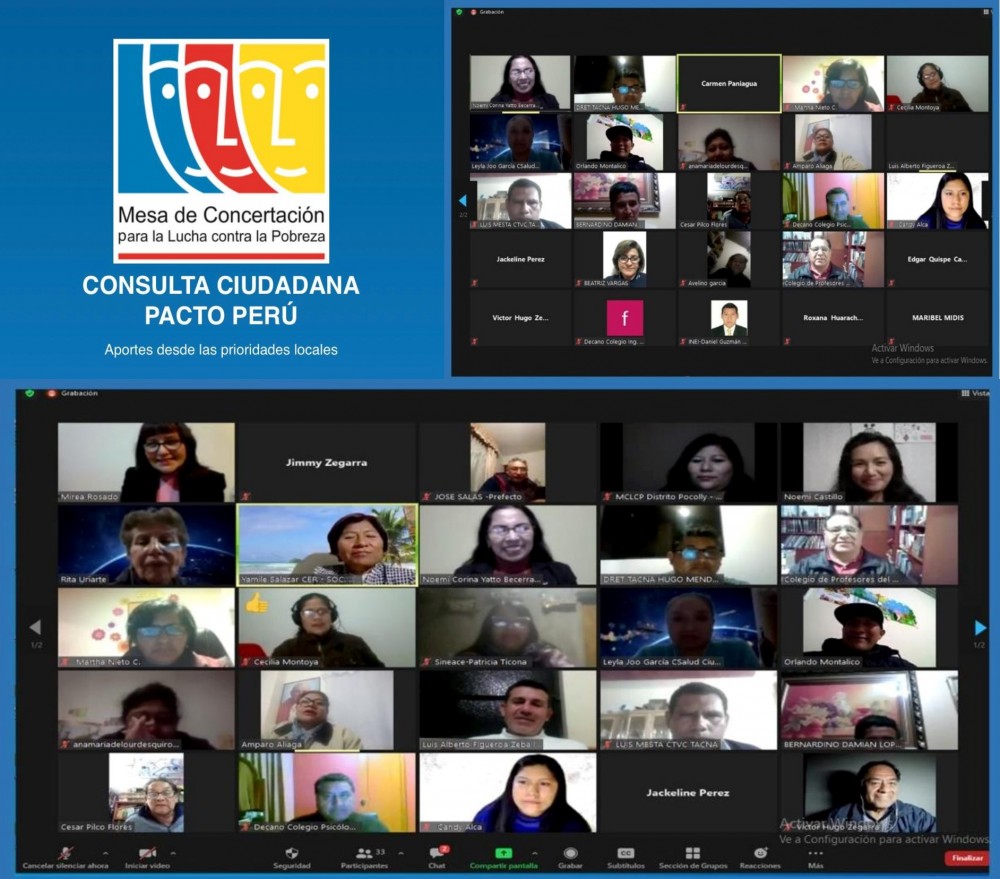 La Mesa de Concertación para la Lucha Contra la Pobreza de Huánuco llevó a cabo la Consulta Nacional Pacto Perú: Taller virtual regional el día 01 de Octubre del 2020, con el objetivo de e identificar los problemas y recoger propuestas concertadas en tres ejes principales: salud, educación y lucha contra la pobreza, desde una mirada regional y contribuir a la construcción del Pacto Perú.